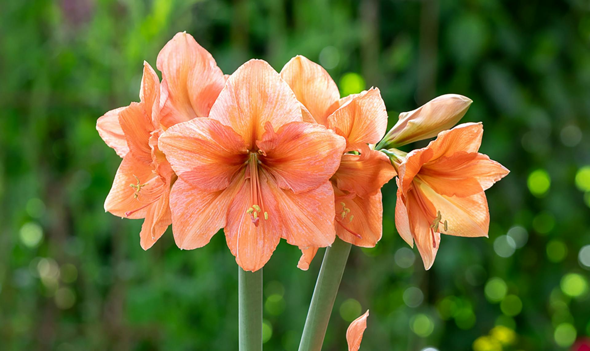 The tall amaryllis stalks grow from bulbs, and each stalk bears four huge blooms.